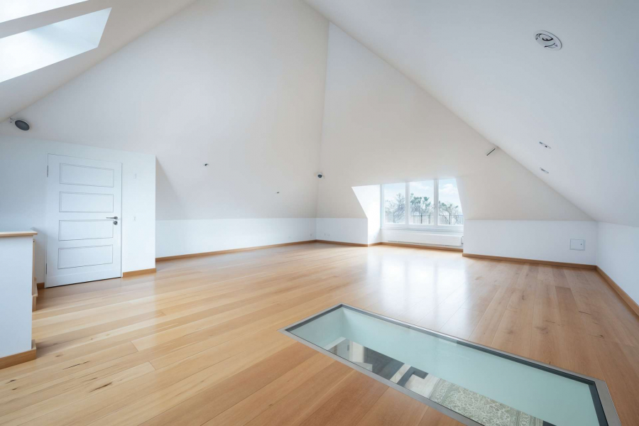 Im Obergeschoss setzt sich das anspruchsvolle Wohnkonzept fort. Mehrere Schlafzimmer, ein Ankleidezimmer sowie ein großzügiges Badezimmer mit freistehender Badewanne, Dusche und Sauna schaffen einen komfortablen Rückzugsbereich. Das Dachgeschoss dient derzeit als Fitness- und Bewegungsraum und profitiert von der besonderen Lichtführung und Offenheit, die ein Gefühl von Weite vermittelt.