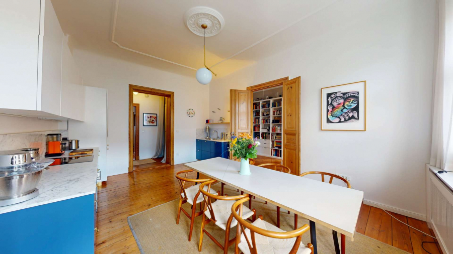 Charakteristische Altbauelemente wie Stuckverzierungen, hohe Decken, große Fensterflächen und ein gepflegter Dielenboden schaffen eine helle, einladende Wohnatmosphäre. Besonders hervorzuheben sind die zweiflügeligen Altbautüren, die die Räume elegant miteinander verbinden und dem Grundriss Offenheit und Weite verleihen.