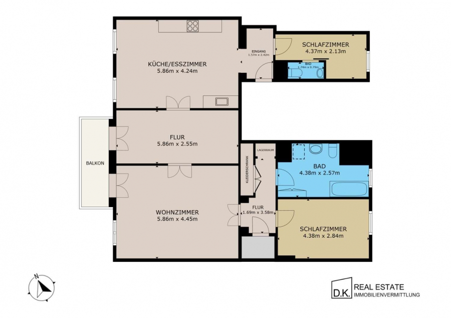 Das modern ausgestattete Tageslicht-Badezimmer verfügt sowohl über eine Badewanne als auch eine bodentiefe Dusche. Ergänzend dazu steht ein separates Gäste-WC zur Verfügung. Ein Abstellraum innerhalb der Wohnung bietet zusätzlichen Komfort im Alltag.