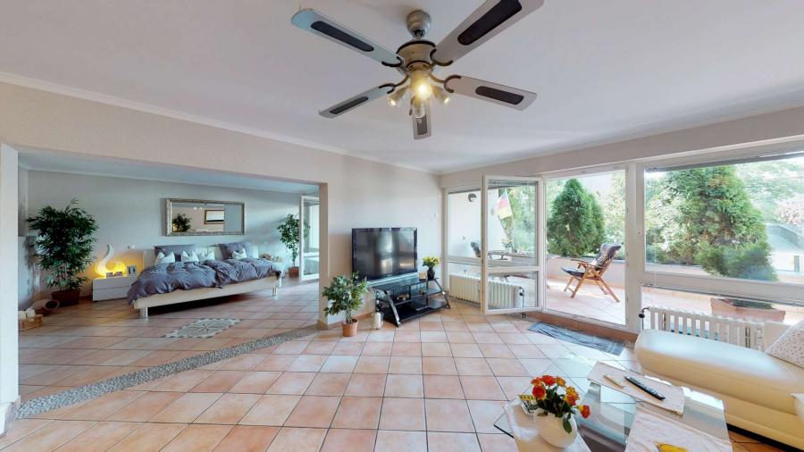Der zweite Raum bietet Ihnen einen komfortablen Schlafbereich, der zudem genügend Platz für einen Arbeitsbereich oder kreative Projekte lässt. Von hier aus erreichen Sie die zweite große Loggia – ein ruhiger Rückzugsort im Freien. Direkt angrenzend liegt das stilvolle Tageslicht-Badezimmer, das mit einer bodentiefen Dusche, Fußbodenheizung, Doppelwaschbecken und einem Urinal keine Wünsche offenlässt. Ein separates Gäste-WC mit Badewanne ergänzt das Angebot perfekt und sorgt für zusätzlichen Komfort.